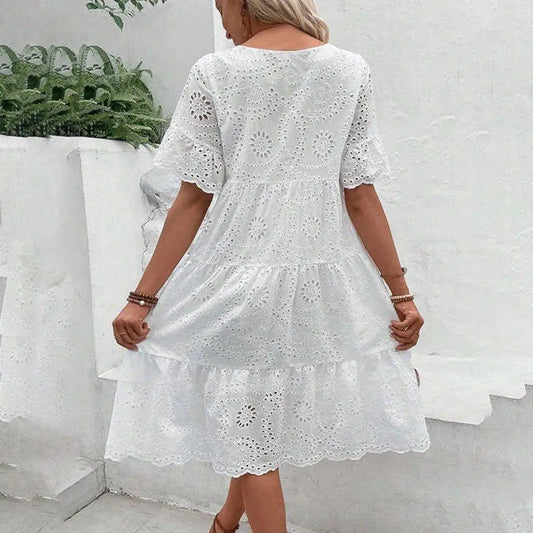 Women's Long Simple Casual Solid Hollow Out Pure Cotton Holiday Style High Waist Fashion Mid-Calf Summer Dresses NEW Vestidos