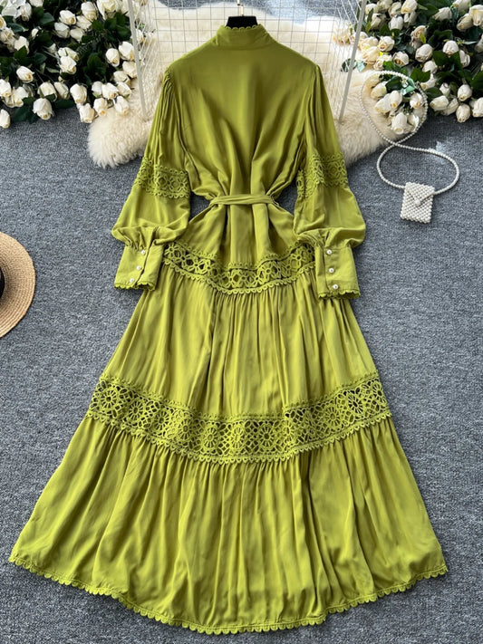 Women Lace Patchwork Pearl Button Single Breast Belt A Line Loose Party Vestidos