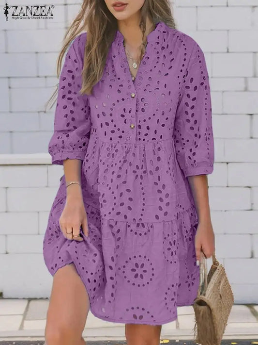 ZANZEA Women Fashion Hollow Out Embroidered Short Dress Holiday Casual Loose 3/4 Sleeve Knee-length Vestidos Lace Patchwork Robe