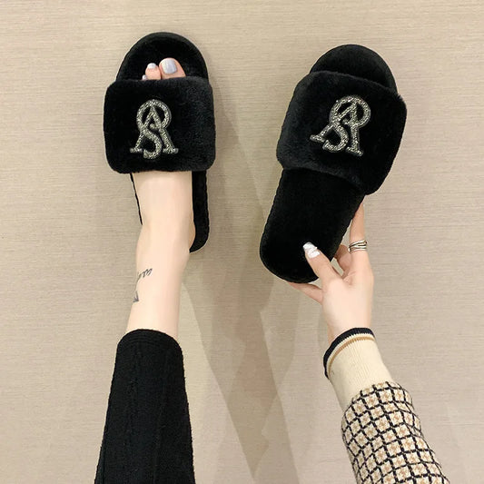 Female Home Cotton Slippers Women Autumn Winter Hairy Warm Footwear Fashion Letter Rhinestones Sandals Woman Casual Flat Shoes